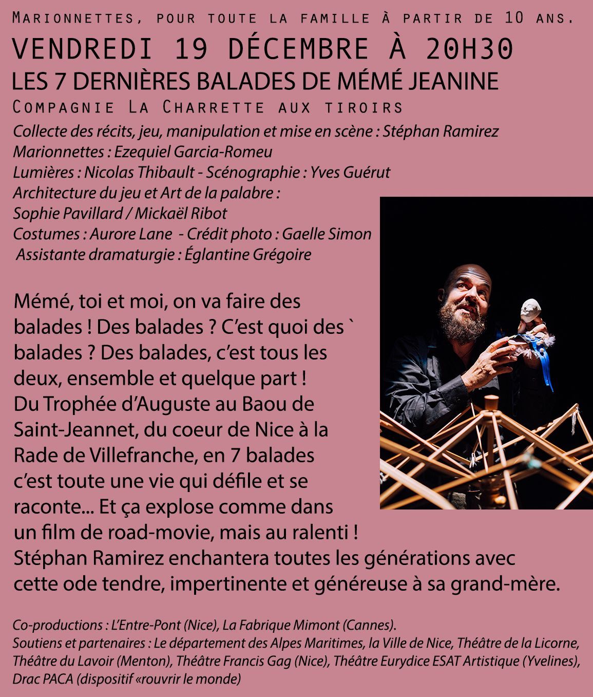 AU PLAISIR DE VOUS RETROUVER POUR NOTRE PROCHAIN SPECTACLE : LES 7 DERNIÈRES BALADES DE MÉMÉ JEANINE Un superbe spectacle de marionnettes pour toute la famille à partir de 10 ans... plein de tendresse pour les grand parents et pour notre belle région...